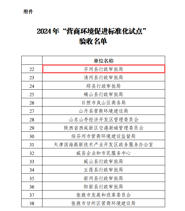 近日,中国贸促会贸易行业委员会发布了2024年“营商推进尺度化试点”验收名单,市齐河县行政审批办事局成功通过验收。近年来,齐河县行政审批办事局将推进尺度化做为优化营商的主要行动,按照同一规范、公开通明、办事高效的准绳,立异开展审批办事营业流程尺度化建立工做,构成了以“审批流程”为焦点,以“智能审批”为引擎,以“轨制规范”为保障,各环节彼此融合、彼此推进、闭环办理的营业流程尺度系统,打制了“无不同受理、同尺度打点”的审批办事模式,获评国度“AAAA尺度化优良行为单元”等荣誉称号。